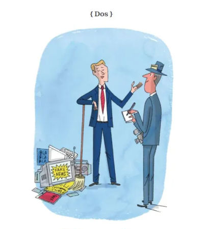 La segunda viñeta presenta a un dircom “portavoz e imagen de su empresa”, hablando con un periodista y barriendo fake news.