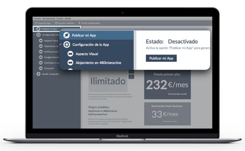 Usar 480interactive, crear proyectos app y previsualizarlos en los dispositivos móviles es gratuito. Una vez se quiera publicar la app en App Store y Google Play, se deberá activar la opción de pago ‘Publicar mi App’, la cual ahora es flexible y cuyo precio es calculado en función del número de contenidos y plugins añadidos a la aplicación.