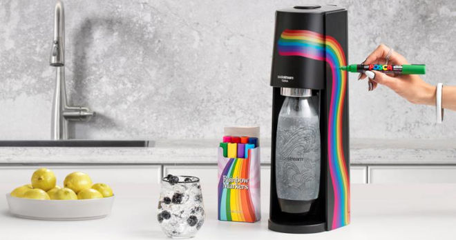 Para compartir este mensaje ha creado una edición especial de su modelo TERRA, que incluye la máquina en un elegante negro mate, un cilindro de CO2 para gasificar, una botella reutilizable de 1 litro con un diseño especial apto para colorear, y 8 rotuladores de colores (rojo, naranja, amarillo, verde, azul, azul claro, morado y rosa), que representan los nuevos grupos que existen dentro de la comunidad LGTBIQ+, invitando a los consumidores a personalizar tanto sus máquinas como sus botellas escribiendo e ilustrando sus historias y banderas de orgullo personales representadas con los colores que ellos decidan. “En SodaStream defendemos a las personas sin importar su género, origen, religión u orientación sexual”, declara Karin Schifter-Maor, CMO global de SodaStream.