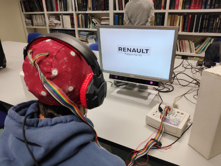 En el estudio participaron 30 hombres y mujeres (50÷50), de 18 a 25 años, con lengua materna español y bilingües en inglés, estudiantes de Ciencias Económicas, ADE, Marketing y Publicidad de la Universidad Nebrija y la Universidad Autónoma de Madrid. La actividad eléctrica cerebral se registró utilizando un electroencefalograma (EEG) mientras a cada uno de los sujetos se les presentaba un protocolo con imágenes de diferentes marcas con su eslogan, tanto en español como en otro idioma.