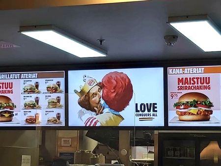 Burger King ha lanzado en Finlandia una campaña de publicidad centrada en la manifestación y en homenaje al amor, en todas sus formas y variantes. Aprovechando la celebración del “Helsinki Pride”, la festividad del orgullo en el país, Burger King ha publicado la campaña Love conquers all, en la que demuestra su amor por su principal competidor, McDonald’s, a través de un dibujo donde sus icónicas mascotas aparecen en actitud cariñosa.