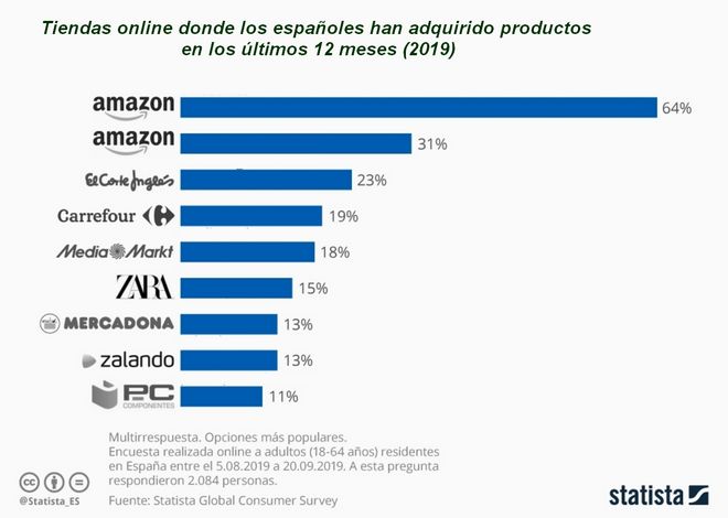 Internet es el gran aliado de los compradores. La revolución de los comercios online genera una facturación anual cercana a los 400.000 millones de euros. Según la encuesta Statista Global Consumer Survey, Amazon.es y Amazon.com son las páginas de e‑commerce que más compradores utilizaron en el año anterior a la encuesta, con un 64% y 31% de respuestas del sondeo a su favor, respectivamente. Así, Amazon cuenta con un volumen de facturación anual estimado en 2.168 millones de euros. A estas le siguieron elcorteingles.es (con un 23%), carrefour.es (con un 19%) y mediamarkt.es (con un 18%). Otras webs como zara.com, mercadona.es, zalando.es o pccomponentes.com también tienen una gran relevancia en el comercio online de nuestro país.