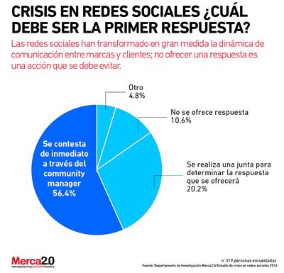 Al respecto, el Estudio de Crisis en Redes Sociales 2016, realizado por el Departamento de Investigación de Merca2.0, revela que la principal acción que deben realizar las marcas al momento de enfrentar una situación que amenace su imagen es dar una respuesta inmediata a través del community manager. Así lo refiere el 56% de las personas.
