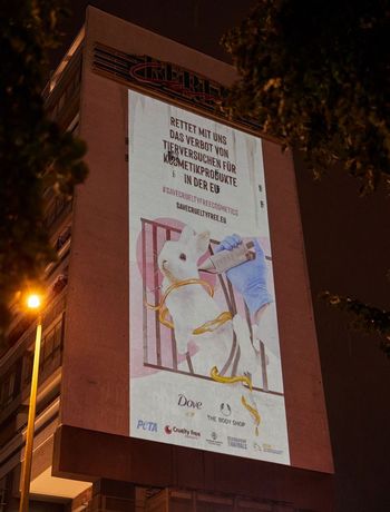 Bajo estas circunstancias han lanzado una campaña bajo el lema #EndAnimalTesting que ha visto la luz en París, Berlín, Madrid y Milán, donde han lanzado un mensaje que se puede leer en las pareces de diferentes monumentos: “Únete a nosotros para acabar con la experimentación en animales y salvar los cosméticos Cruelty Free en Europa”.