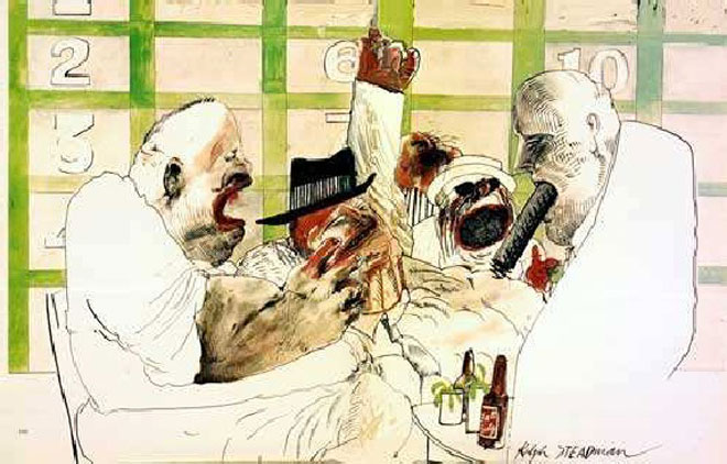 Dejé a Steadman garabateando en el Paddock y me dirigí a realizar nuestras apuestas para la cuarta carrera. Cuando regresé, él observaba intensamente a un grupo de jóvenes sentados entorno a una mesa, no muy lejos de ahí. “Jesús, mira la corrupción en esa cara!” susurró. “¡Mira la locura, el miedo, la avaricia!” Miré, y me apresuré a volver a mirar el dibujo sobre la mesa. La cara que él había elegido para retratar, era la cara de un viejo amigo mío, una estrella del fútbol pre-universitario de los buenos viejos tiempos, que tenía un elegante Chevy convertible de color rojo y una mano muy rápida, se decía, para desabrochar sujetadores de la talla 32 B. Lo llamaban “El Hombre Gato”.