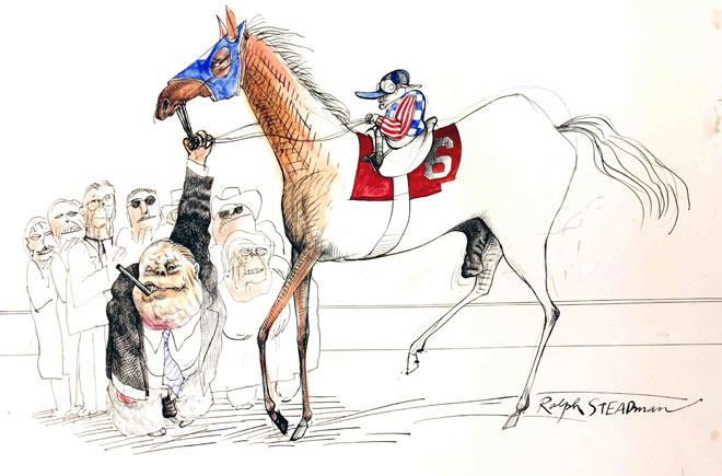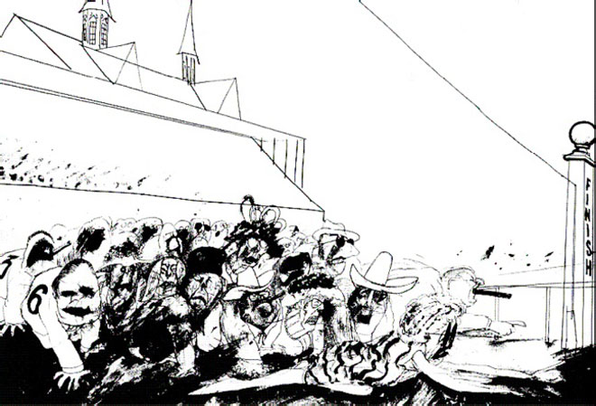 Regresamos al Club para ver la gran carrera. Cuando la multitud se paró para cantar “My Old Kentucky Home” con la bandera en alto, Stedman se puso enfrente de ellos y comenzó a dibujarlos histéricamente. Desde algún lugar de los salones una voz chilló, “agáchate, hippie idiota”. La carrera sólo duró dos minutos, e incluso desde nuestros asientos de clase privilegiada y usando los binoculares más poderosos, no había forma de ver lo que estaba sucediendo realmente con nuestros caballos. Dios Santo, el caballo de Ralph, tropezó y perdió a su jinete en la última vuelta. El mío, Silent Screen, lideró la carrera hasta la última vuelta, pero cayó al quinto puesto en la recta final. El ganador, llamado Dust Commander, pagaba 16 a1.