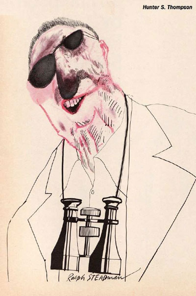 El resto del día fue de pura locura. El resto de la noche también. Lo mismo al día siguiente. Ocurrieron cosas tan horribles que ni siquiera puedo pensar sobre ellas ahora, y menos aún publicarlas. Tuve suerte de escapar con vida. Uno de los recuerdo más claros que tengo de esos días, es el de Ralph siendo atacado por uno de mis viejos amigos en el salón de billar del Club Pendennis, en el centro de Louisville, la noche del sábado. El hombre se había arrancado los botones de su camisa hasta la cintura al imaginar que Ralph estaba detrás de su mujer. No hubo golpes, pero los efectos emocionales fueron enormes. Luego, como si fuera el epílogo final al horror, Steadman puso a trabajar su diabólico lápiz y trató de arreglar las cosas haciendo un pequeño retrato de la mujer a la que supuestamente había estado cortejando. Tuvimos que huir del Pendennis.