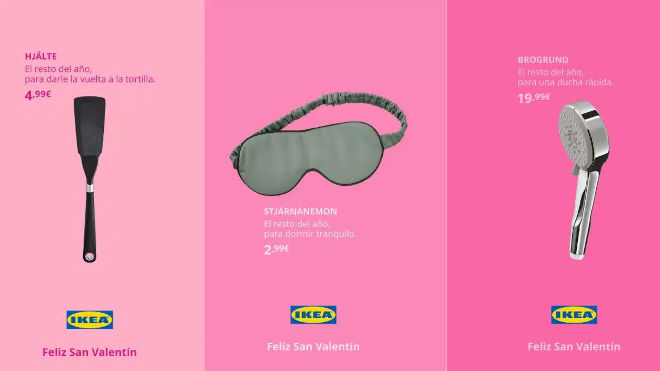 En esta divertida campaña se presentan tres productos: el antifaz STJÄRNANEMON, la espátula HJÄLTE y la ducha BROGRUND. Y junto a estos aparecen mensajes que proponen otros usos ellos. «El resto del año, para dormir tranquilo» acompaña el antifaz. «El resto del año, para darle la vuelta a la tortilla» en referencia a la espátula. «El resto del año, para una ducha rápida» en la imagen de la ducha. De esta forma, IKEA deja a la imaginación todas las funcionalidades que pueden llegar a tener sus productos, especialmente durante el Día de los Enamorados.