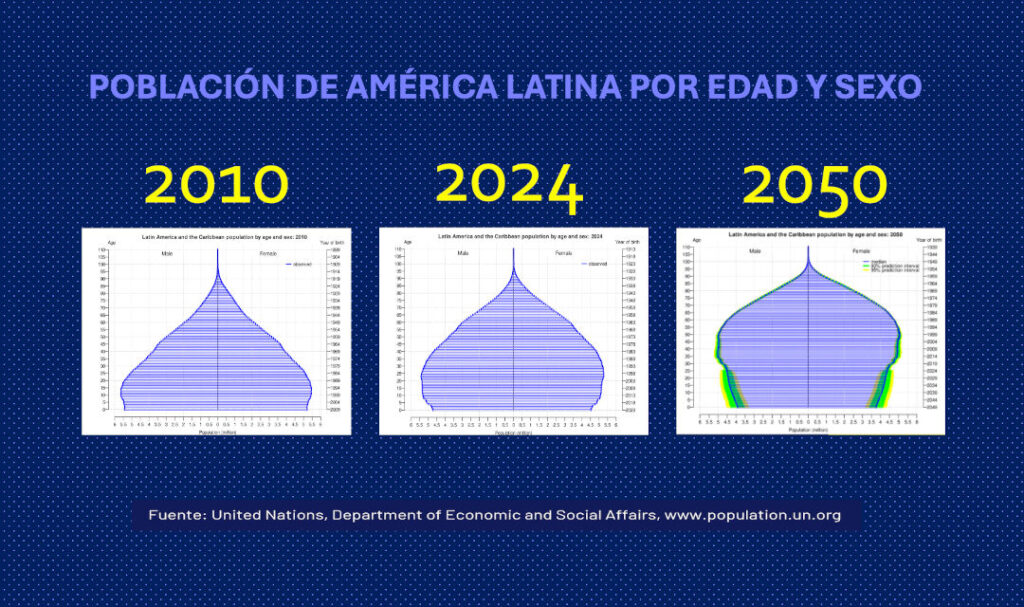 El estudio de Ipsos analiza la evolución de las pirámides poblacionales en Latinoamérica y el Caribe desde el año 2010 hasta las proyecciones para 2050, evidenciando un cambio estructural donde la base demográfica se estrecha progresivamente mientras que la cima se ensancha de manera considerable. Este modelo de transición demográfica implica que el grupo de mayor edad representará una porción cada vez más relevante del mercado de consumo. Las proyecciones a largo plazo son aún más reveladoras: para el año 2100, la proporción de personas mayores de 60 años en Latinoamérica será mayor que en regiones como Asia, América del Norte, Oceanía y África.