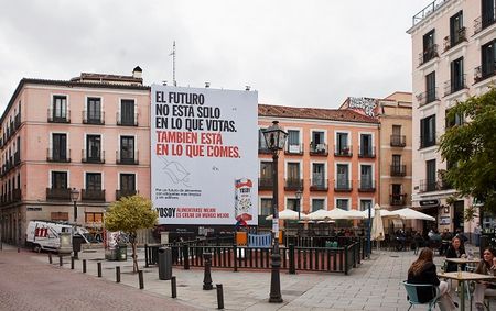 A esta lona gigante le acompaña una acción de street marketing, en la que se han colgado carteles reivindicativos. “No entender a los políticos es algo normal. Que no entendamos las etiquetas de nuestros alimentos no debería serlo”, es la lógica que muestra uno de ellos.
