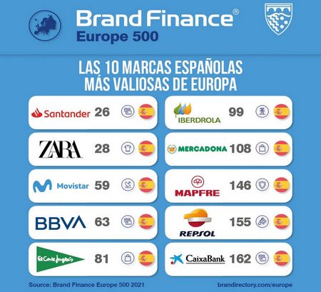 Se tienen 31 marcas españolas incluidas en el ranking Brand Finance Europa 500 2021, mismas que aportan el 5% del total de su valor de marca. La suma de valor de marca de todas las españolas asciende a 84.571 millones de euros, 10.458 millones menos del valor que poseían estas marcas en 2020.
