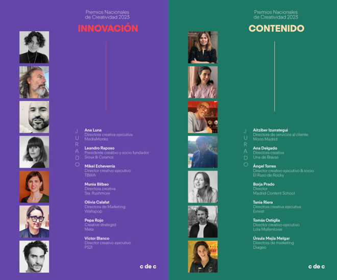 En el jurado de INNOVACIÓN encontramos a Ana Luna, directora creativa ejecutiva en MediaMonks; Leandro Raposo, presidente creativo y socio fundador de Sioux & Cyranos; Mikel Echebarria, director creativo ejecutivo en TBWA; Munia Bilbao, directora creativa en Sra. Rushmore; Olivia Calafat, directora de marketing de Wallapop; Pepa Rojo, creative strategist de Meta, y Víctor Blanco, director creativo ejecutivo en PS21.