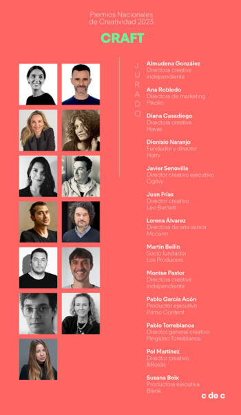 Los profesionales a cargo del jurado de CRAFT son Almudena González, directora creativa independiente; Ana Robledo, directora de marketing y comunicación de Pikolin; Diana Casadiego, directora creativa en Havas; Dionisio Naranjo, cofundador y director en Harry; Javier Senovilla, director creativo ejecutivo en Ogilvy; Juan Frías, director creativo y head of art en Leo Burnett; Lorena Álvarez, directora de arte senior en McCann; Martín Beilin, socio fundador y producer senior de Los Producers; Montse Pastor, directora de arte y directora creativa independiente; Pablo García Acón, productor ejecutivo de Primo Content; Pablo Torreblanca, socio fundador y director general creativo en Pinguino&Torreblanca; Pol Martínez, director creativo en &Rosàs, y Susana Boix, productora ejecutiva de Blank.