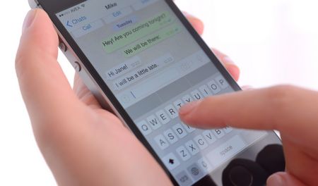 ?stanbul, Turkey – January 24, 2015: Hand holding a iPhone 5s displaying Whatsapp application on a white background. iPhone is a touchscreen smart phone produced by Apple Inc.