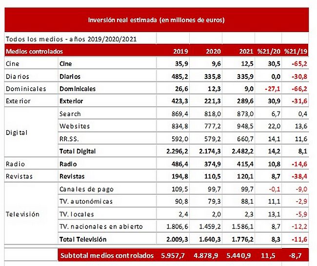 De acuerdo al último estudio presentado por Infoadex, el mercado de inversión publicitaria de 2021 ha seguido marcado por la evolución de la pandemia. Los periodos de transmisión más baja han promovido un incremento de la inversión en los diferentes sectores que se ha contrarrestado con el pico de las peores olas del año, que han coincidido con un nuevo estancamiento del sector. No obstante, el último año se ha cerrado con sensaciones y números positivos en el que la inversión publicitaria ha crecido un 7,8% y que se traduce en los 11.601,9 millones de euros.