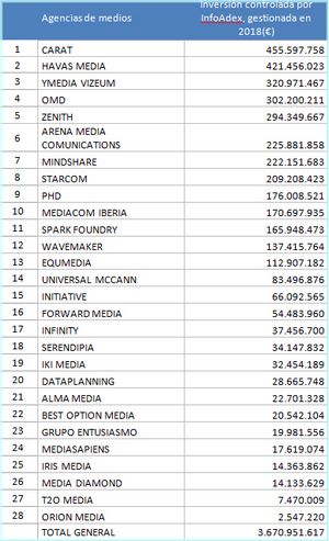 En sus conclusiones, el ranking de InfoAdex señala que la primer agencia de medios, en cuanto al volumen de inversión publicitaria gestionada en 2018, fue Carat. El estudio detalla que gestionó más de 455 millones de euros, dato que mejora en más de doce millones las cifras obtenidas un año antes. Le siguen Havas Media e Ymedia Vizum cerrando el podio de inversión gestionada.