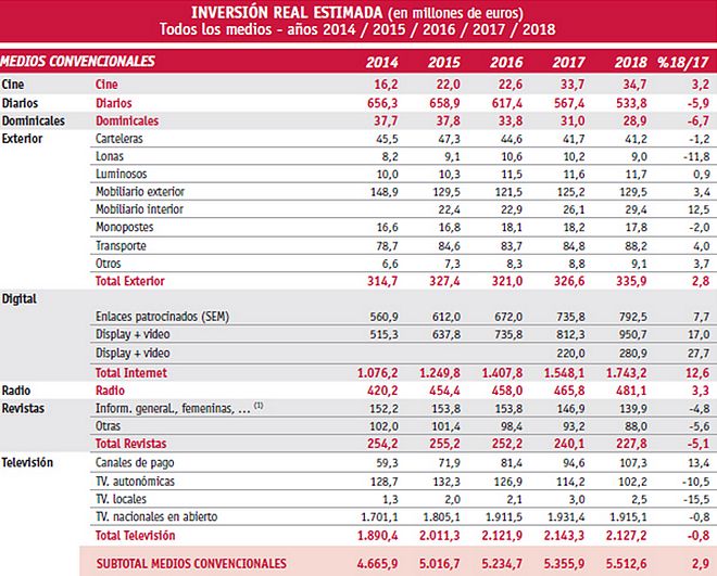 Entre los medios convencionales, la televisión sigue siendo el formato preferido por los anunciantes y obtuvo en 2018 un total de 2.127 millones de euros, un 0,8% menos que en 2017. De todos modos, más de uno de cada tres euros invertidos en medios convencionales fueron a la televisión (38,6%). Cabe destacar el notable aumento de la inversión que se ha realizado en los canales de pago (+13,4%), que ya obtienen más ingresos por publicidad que las televisiones autonómicas (107,3 vs 102,2 millones de euros).