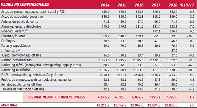 Entre los medios no convencionales, destaca la inversión en mailing personalizado (1.922 millones de euros), merchandising (1.733 millones de euros) y marketing telefónico (1.570 millones de euros). Los responsables del estudio han querido destacar la inversión en influencers, valorada en 2018 en 37 millones de euros; y en branded content, por encima de los 316 millones de euros. En todo caso, el marketing móvil es el medio no convencional que aumenta más sus ingresos publicitarios, con 53,8 millones (+44,2%); en este apartado se incluyen mensajería, advergaming, apps y otros.
