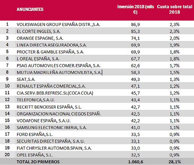 En el lado de los anunciantes, Volkswagen se convirtió en 2018 en el grupo que más invirtió en publicidad con más 136 millones de euros. Su marca Volkswagen se convirtió en el primer anunciante de 2018, con 86,9 millones de euros; el resto de cajones del podio los ocupan El Corte Inglés (85,3 millones) y Orange (74,1 millones).
