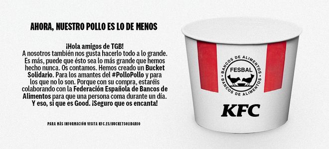 Ante esta situación, KFC ha querido tomar partido lanzando su nuevo “bucket solidario”, animando a sus consumidores a colaborar con los bancos de alimentos. Por ello, KFC ha diseñado tres modalidades de “bucket solidario”, para una, dos o tres personas, con las que contribuir a alimentar a una persona durante un día entero. Esta promoción estará disponible hasta el próximo 3 de agosto en cualquier establecimiento de KFC, a través de sus diferentes canales de venta, con el servicio KFCAuto, con el servicio para llevar, y una vez esté permitido, cuando se pueda consumir en restaurantes.