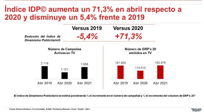 El número de marcas que escogieron tener presencia en televisión fue inferior al de 2019, pero las que lo hicieron tuvieron una actividad más intensa que la registrada hace dos años. Al comparar abril de 2021 con marzo de 2021 se manifiestan resultados positivos: el mercado televisivo creció un 4.8% especialmente favorecido por un importante incremento en el número de campañas, que aumentaron cerca de un 8%.