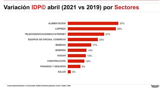 En el detalle por sectores, en el análisis del comportamiento del mercado en abril de 2021 frente al mismo mes de 2019 se aprecia un importante aumento de actividad en alguno de ellos. De esta forma, Alimentación es que el más crece en su Índice de Dinamismo Publicitario (+37%), seguido de Limpieza (+35%) y Telecomunicaciones e Internet (+27%).