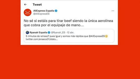 Por supuesto, el CM de AliExpress no se quedó callado. “No sé si estáis para tirar beef siendo la única aerolínea que cobra por el equipaje de mano”, escribió la firma. Lejos de quedarse ahí, Ryanair volvió a citarles, esta vez con una captura de pantalla de la interfaz de la plataforma de ventas, junto al siguiente mensaje: “5 euros te pueden llevar lejos… en algunos lugares. El equipaje de mano es opcional como el beef, recuerda”.