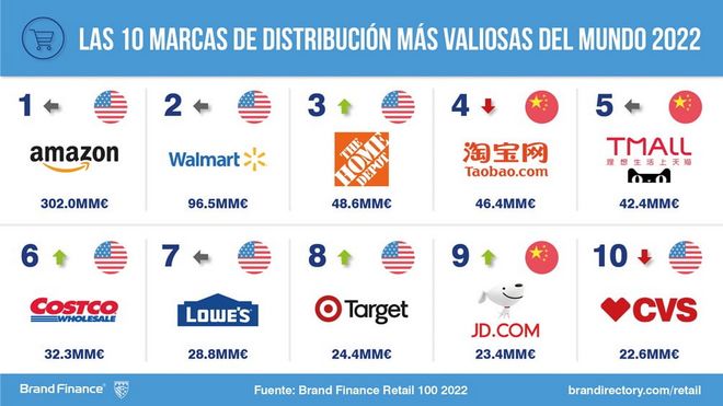 Amazon se mantiene en primera posición como la marca minorista más valiosa del mundo, con un aumento del 39,6% interanual y un valor de 302.038 millones de euros. Walmart ocupa la segunda posición, con 96.500 millones de euros. The Home Depot, Taobao, Tmall, Costco, Lowe’s, Target, JD y CVS también forman parte de la lista.