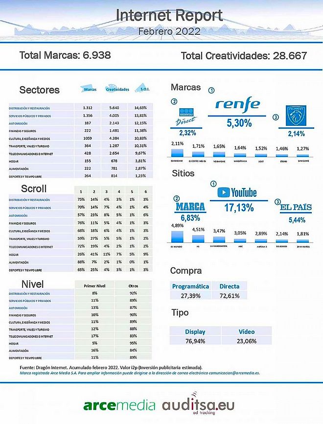 Estas cifras forman parte del último informe de Arce Media-Auditsa, que analiza la inversión publicitaria digital de febrero. Este ha repasado un total de 28.667 creatividades procedentes de 6.938 marcas.