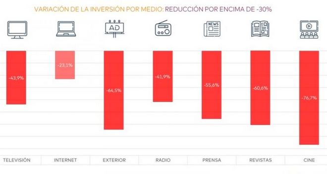 Según el barómetro, durante los próximos seis meses el sector de la publicidad vivirá una época de pérdidas continuas. De hecho, el 72% de los anunciantes afirma que ha tenido que reducir su inversión en publicidad desde el inicio de la crisis, mientras que un 22% de profesionales indica que ha mantenido estable su inversión publicitaria y un 6% señala haberla incrementado. La variación promedio estimada se sitúa en un ‑25,4% global, si bien es cierto que en algunas categorías la caída ha sido mucho mayor.