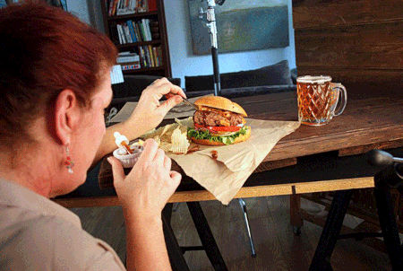 Otra técnica común es la de usar puré de papas en lugar de helado real para las tomas. El puré se mezcla con colorantes alimentarios, para simular el aspecto del helado, pero sin derretirse bajo el calor de las luces de los sets. En las hamburguesas se ponen cartones entre cada capa para dar altura y las salsas se aplican con jeringas, para evitar que se vean desbordadas.