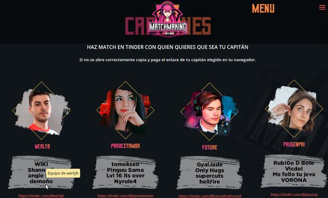 Los más de 2.400 usuarios de Tinder y fans de League of Legends (LoL) inscritos en Tinder Matchmaking tenían la posibilidad de formar parte de los 4 equipos participantes en el torneo de este popular videojuego haciendo “match” a través de la propia aplicación con Werlyb, Paracetamor, Future y Pausenpai, capitanes y conocidos influencers del mundo gamer. Las dos jornadas de duración del torneo, cuyos casters fueron Mery Soldier y Aitorek, fueron retransmitidas por streaming a través del canal Twitch de Werlyb. El equipo ganador obtenía una suscripcion a Tinder Gold, una skin de LoL y un encuentro con los influencers.