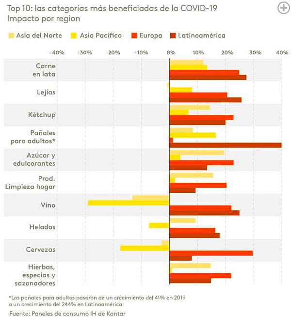En el caso de Europa, uno de los productos que más creció en 2020 fueron las cervezas. En Asia del Norte el azúcar y los edulcorantes fueron los grandes triunfadores, mientras que en Asia Pacífico fueron los pañales para adultos. Esta categoría destaca sobre todo en Latinoamérica, donde pasó a tener un crecimiento del 41% en 2019 a un estirón del 244% en 2020.