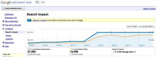 El anuncio de las nuevas funcionalidades en sus herramientas de medición se ha hecho recientemente. Por ejemplo, en Google Webmaster Tools, en la sección Metrics, ahora se pueden obtener informes del impacto del botón +1 en las búsquedas realizadas por la audiencia. Además, se pueden obtener dos valiosos informes: el de “Actividad”, en donde se detalla cuántos +1 ha logrado un sitio web, y “Audiencia”, que nos brinda referencias de tipo demográfico y geográfico de las personas que han utilizado el botón +1 en esa página.