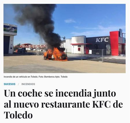 El pasado 18 de enero, frente al nuevo KFC de Toledo, a Rubén Gamero se le quemó su coche. La imagen del coche en llamas junto al logo de la compañía protagonizó ese día las portadas de la prensa local, convirtiendo el incidente en publicidad para la marca. Ahora, la compañía de Kentucky le regala un nuevo coche, en agradecimiento. Esto es publicidad realista en su más pura expresión.