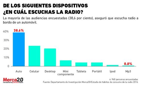 Lo anterior fue trascendido por el Estudio de Hábitos de Consumo de la Radio 2016, conducido por el Departamento de Investigación de Merca2.0, donde se encontró que un 38,6% de las audiencias encuestadas preferían escuchar la radio del automóvil, mientras que un 23,3% dijo preferir su smartphone para sintonizar una estación de radio.