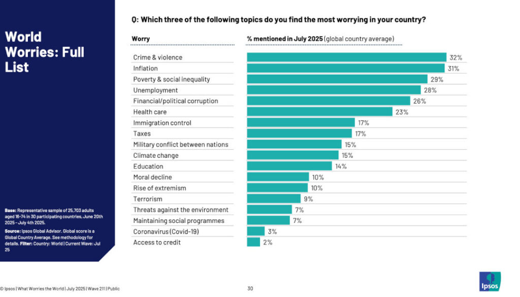 El más reciente estudio de la firma líder en investigación de mercado, Ipsos, revela un inesperado cambio en el panorama de las preocupaciones globales. La última edición del informe What Worries the World? señala que el crimen y la violencia han escalado para convertirse en la principal inquietud a nivel mundial, superando a la inflación por un punto porcentual. La investigación, que se sustenta en datos comparativos de más de una década, analiza la opinión de los ciudadanos en 30 países y mide su percepción sobre la dirección en la que avanza su nación.