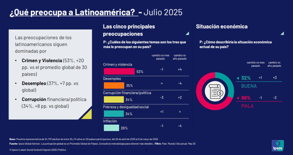 Martín Tanzariello, gerente de Marketing y Comunicaciones de Ipsos Argentina, destaca la particularidad del contexto regional: “América Latina cuenta con su propia realidad. En un contexto donde 7 de cada 10 latinos describe la situación económica de su país como mala, el crimen y la violencia siguen siendo la principal preocupación en la región y se mantiene dentro del Top 5 de las preocupaciones LATAM, muy por encima del promedio global”. El experto añade que el desempleo y la corrupción son las otras dos preocupaciones más pronunciadas en América Latina que en el resto del mundo.