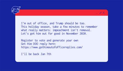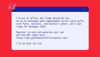 “La impugnación fue divertida, pero sabíamos que para sacar a Trump de su cargo, teníamos que mantener el impulso en el año electoral 2020. Además, son fiestas y la temporada de correos electrónicos de fuera de la oficina alcanza su punto máximo. Así que, en lugar de escribir nuestras respuestas habituales de “Que pases una divertidas y seguras vacaciones”, decidimos crear un generador de correo electrónico Out Of Office (OOO) que te ayude a conseguir que él esté fuera de la oficina para siempre mientras tú estás OOO”, comenta el redactor Namwan Leavell.