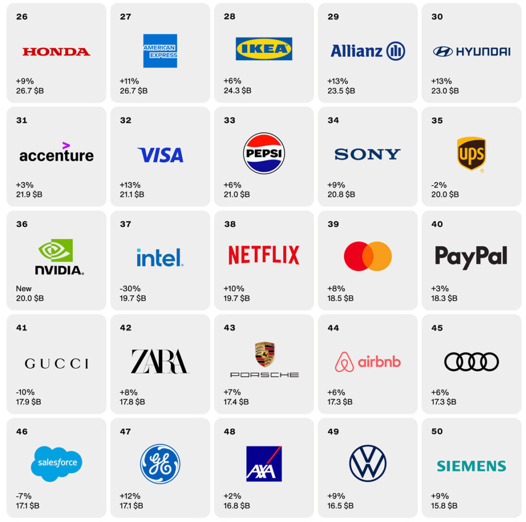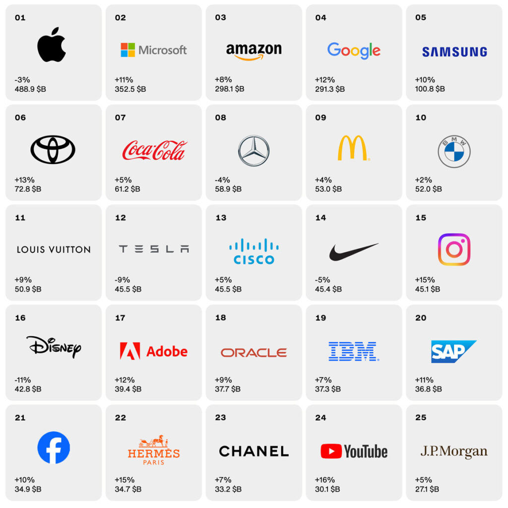 Por décimo año consecutivo, Apple se mantiene como la marca más valiosa del mundo. La firma se mantiene en la cima del ranking gracias a su enfoque en la creación de experiencias integradas y en la innovación de sus ecosistemas tecnológicos. Interbrand señala que Apple ha sabido “anticiparse a las necesidades de los consumidores”, lo que le ha permitido seguir siendo la favorita en un entorno cada vez más competitivo.