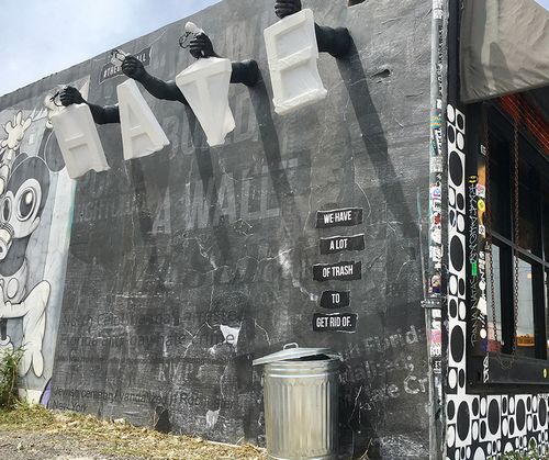 Así, vemos en un muro a modo de escultura, varios brazos que salen de la pared y que sujetan varias bolsas de basura, cada una de ellas con una letra de la palabra “Hate” (odio en inglés) dentro de ellas y acompañada de la frase “Tenemos mucha basura de la que deshacernos”.