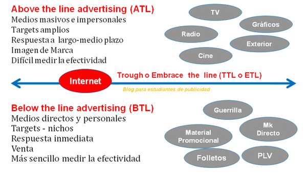 Término inglés, generalmente no traducido al castellano, que se refiere a cualquier tipo de acción publicitaria que no utiliza ninguno de los grandes medios masivos. Los medios below-the-line más utilizados son el marketing directo, marketing telefónico, merchandising, PLV y otras acciones promocionales.