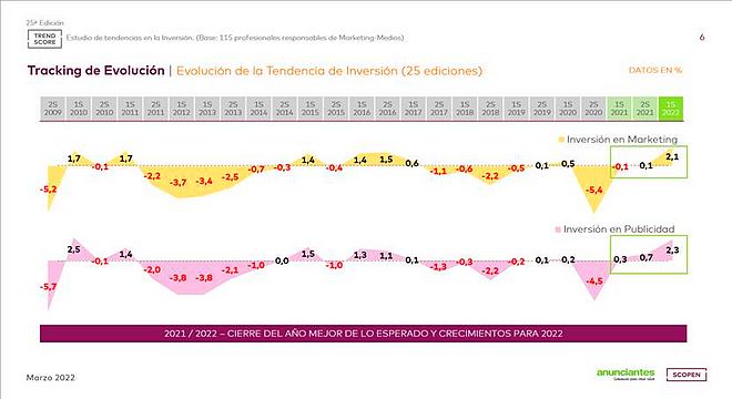 Todos los datos recogidos en la 25ª oleada de TREND SCORE abogan por una evolución positiva de las inversiones en 2022, con índices de tendencia positiva por encima de la media de los últimos 10 años y con incrementos para la mayoría de los anunciantes respecto a su actividad en 2021.