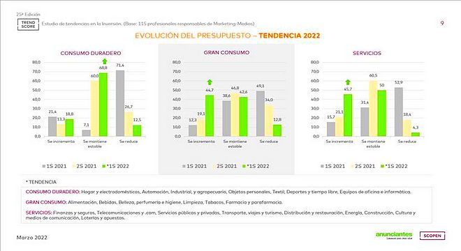 Por sectores, en Gran consumo y Servicios se encuentran los datos de recuperación más positivos. Cerca de la mitad de los anunciantes en estas dos categorías indican un crecimiento importante de sus inversiones respecto a su actividad en 2021. Consumo duradero, por su parte, apunta a un mayor índice de estabilidad.