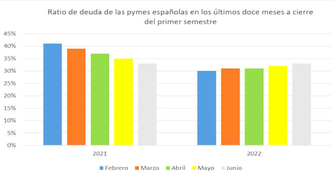 Esta tendencia alcista nada tiene que ver con lo que ocurrió en 2021, cuando observamos que la ratio de deuda descendió hasta en ocho puntos porcentuales. Concretamente, pasó del 47% en febrero de 2021 al 33% en el mes de junio.