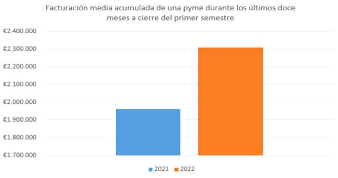 Se lee en el informe Salud financiera de la pyme española en el primer semestre de 2022, elaborado por la plataforma de fintech para pymes Trinios, que las pequeñas y medianas empresas españolas lograron facturar 2,3 millones de euros de media durante el último año. Esto se traduce en 350.000 euros más en comparación con los 1,96 millones promedio de los doce meses previos, un incremento interanual de más del 18%.